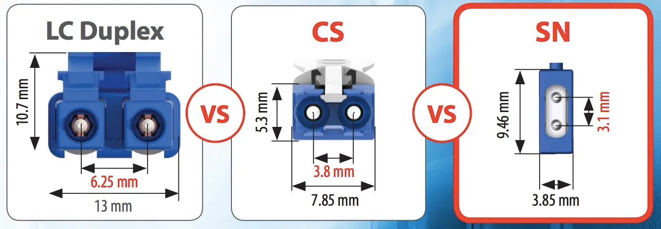 El conector CS® se introdujo como un reemplazo para los conectores LC dúplex actuales, que son demasiado grandes para las interfaces de transceptores de nueva generación y para aumentar la densidad de conectores en los paneles de parcheo. El conector CS® cuenta con un mecanismo de empuje y tracción con dos férulas cilíndricas de 1.25 mm con resorte dentro de una sola carcasa. Las férulas están espaciadas a 3.8 mm, el espacio mínimo posible para cumplir con los requisitos ópticos actuales de TOSA y ROSA. El conector CS® se puede usar con cable con cubierta de 2 mm o 3 mm y está diseñado específicamente para transceptores de próxima generación 200/400G como QSFP-DD y OSFP.