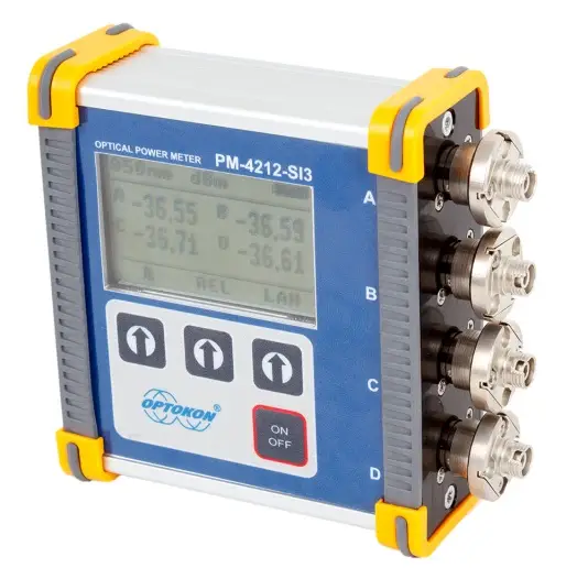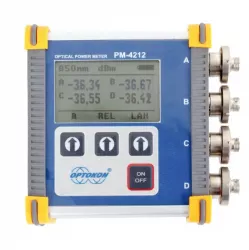 El PM-4212 es un medidor de potencia óptica portátil de 4 puertos. A pesar de su pequeño tamaño, cumple con los requisitos operativos de un probador de tamaño completo. El medidor de potencia está diseñado para la medición simultánea de hasta 4 fibras monomodo o multimodo. Las cuatro interfaces de entrada están equipadas con fotodetectores InGaAs de 1 mm y adaptadores ADP intercambiables para una amplia gama de conectores de fibra monomodo y multimodo. El probador puede usarse como medidor de potencia independiente o como parte de una estación de trabajo de prueba. La comunicación con el software de control se realiza a través del puerto USB o una red Ethernet.